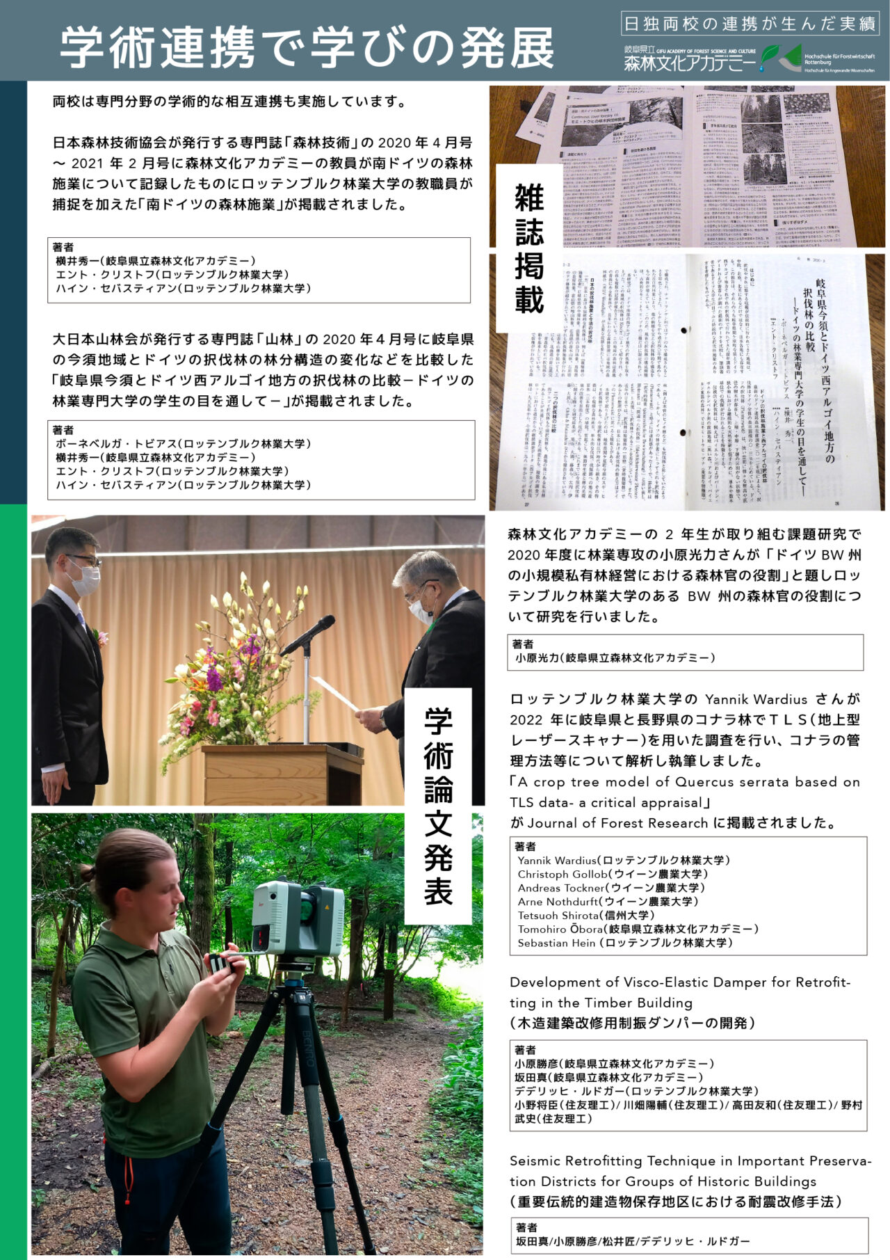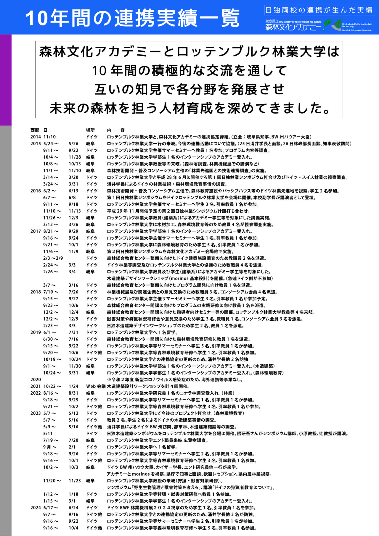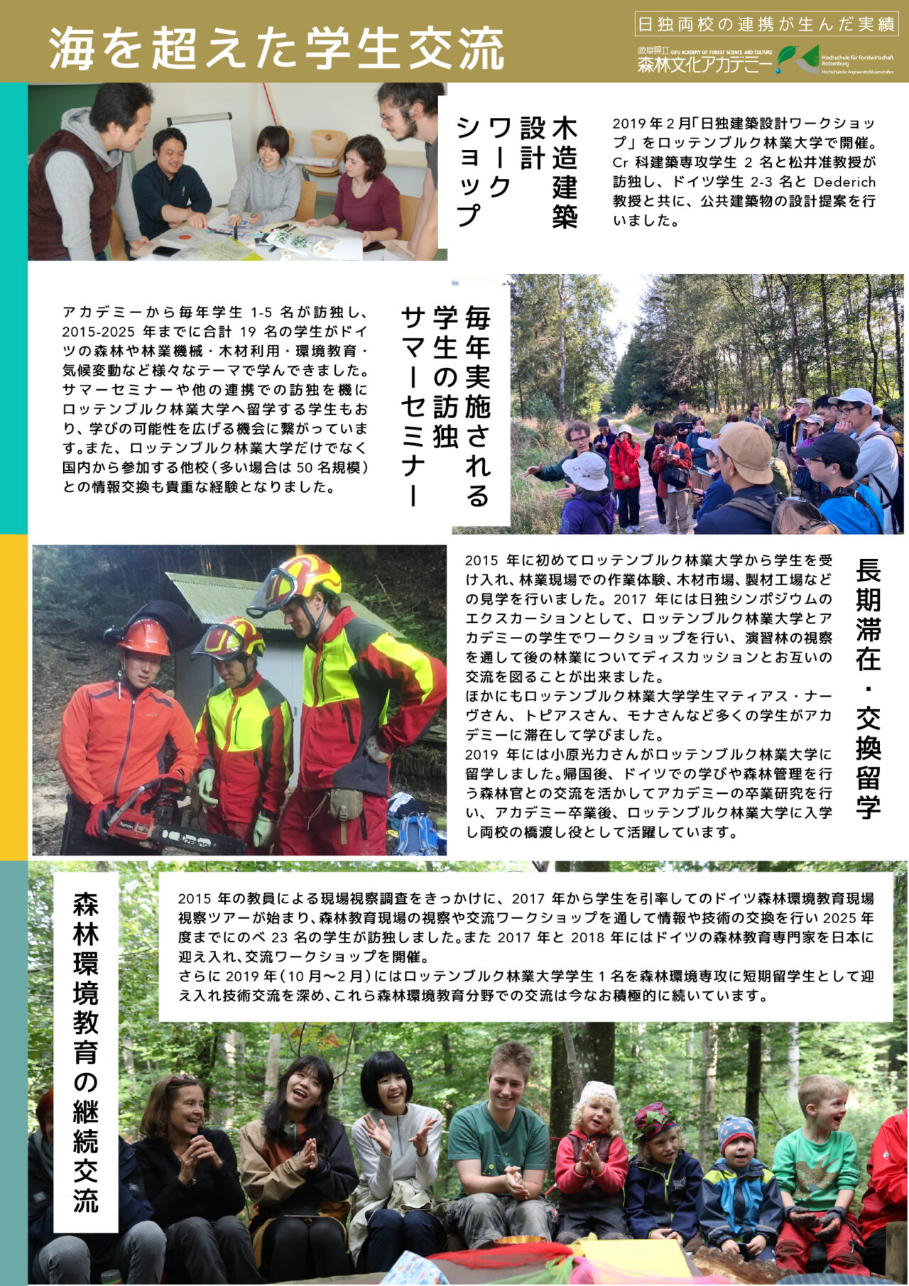 森林文化アカデミーとロッテンブルク林業大学は、10年間の連携によって、広範囲にわたる様々な成果を得ることができました。 主要な成果をポスターにまとめましたので、どうぞご覧ください。(PDF:28.3MB)
