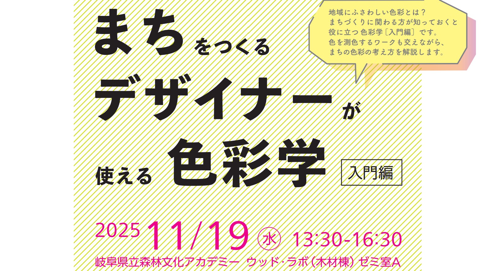 ・まちづくりに関わる人材が地域にふさわしい色彩を使えるようになることで、未来のまちが美しくなります。地方の景観の質を底上げし、地域で暮らす人の誇りや愛着を醸成することがこの研修の目的です。 ・詳しい内容及び申込方法については、「『まちをつくるデザイナーが使える色彩学』入門編」のページをご覧ください。 |