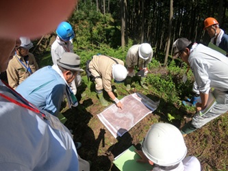 路網開設設計の観点から、地盤が安定していない地形である「三角末端面」、「急傾斜地」、「断層」、「大規模崩壊地」等を歩いて、その地形の特徴(立木変異、断層、鞍部等)を観察しました。