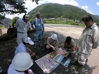 現地研修では、10か所のポイントで研修を行いました。実際に現場を訪れて地図情報、CS立体図等と比較しながら現地の特性について教えていただきました。