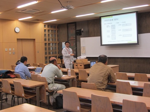 午前中の講義は、岐阜県立森林文化アカデミー産学官連携係 中通実係長です。中通係長は、「木材の流通」・「加工」について長年携わってきた数少ない岐阜県職員で、講義内容は、『スギ等の流通・加工・新たな展開』です。