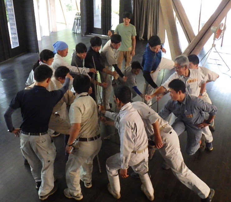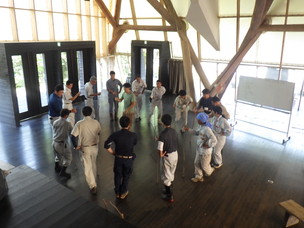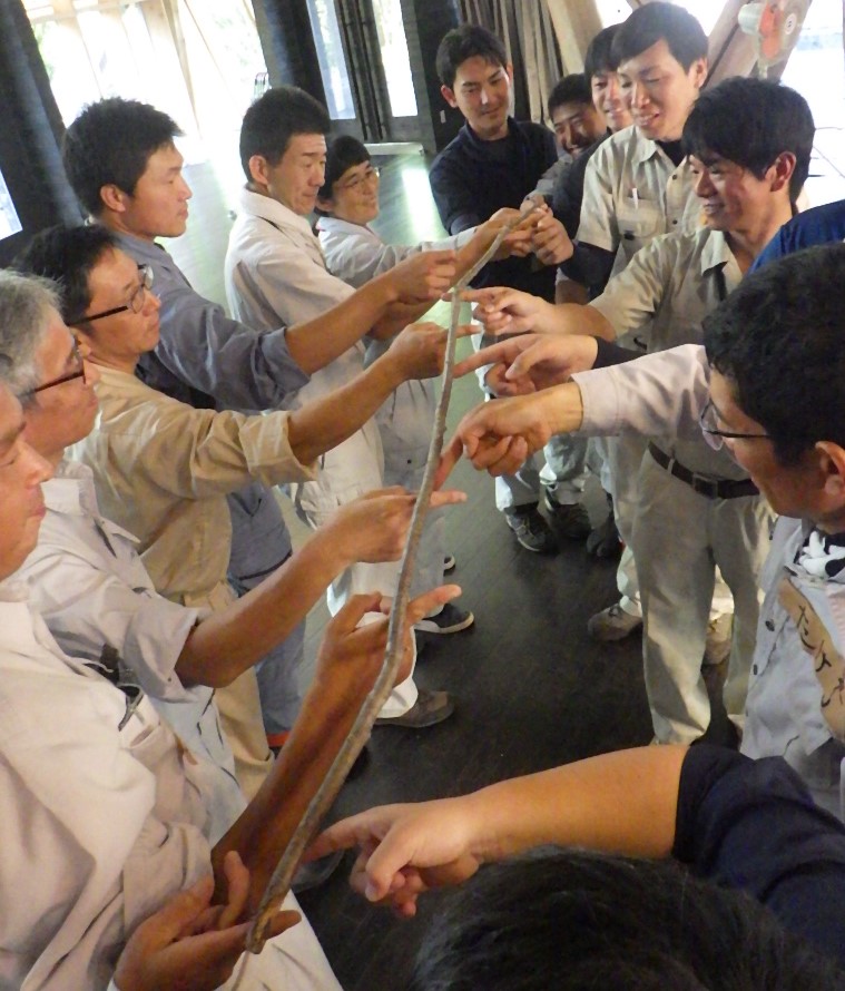 続いて、スティックの一つを人差し指の上において、全員が触れたままバランスを取って下まで下げてくる。これまた自分一人ではどうしようもない。みなで気持ちを一つにすることの重要性を実感です。