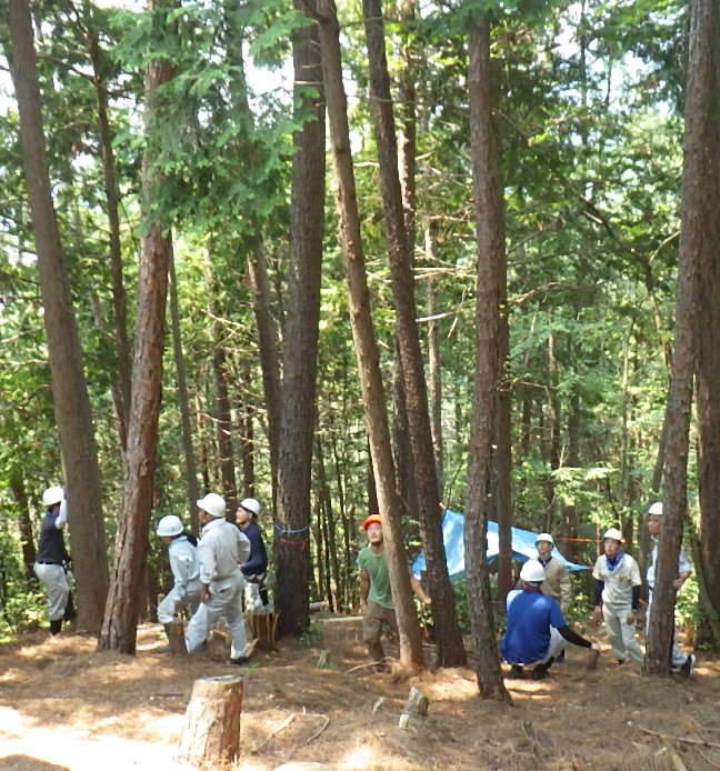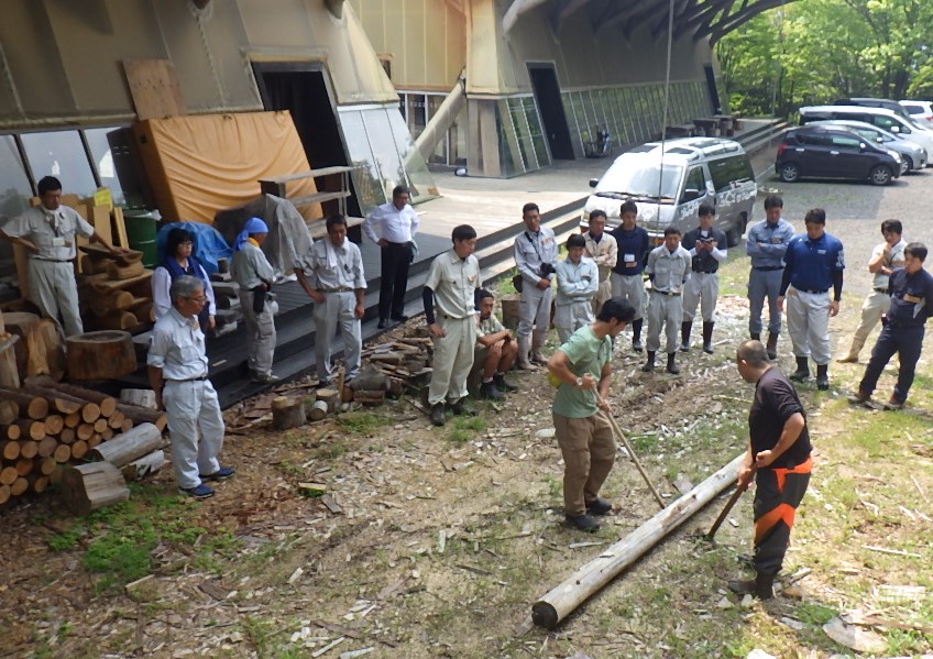 そして外に出て、トビの実践講座です。トビはどう利用するのか、木材の動かし方は、二人で使う場合はどうするのか。見本を示した後は、先生方の実践です。