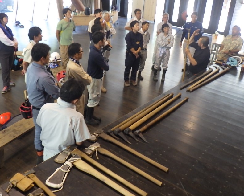 昼食後は江崎さんによる『山の道具講座』、ナタ、手鋸、ツル、トビ、与岐(斧)など、どのような利用方法か。安全に利用するためにはどう使うのかを講義しながら身振り手振りで解説してもらいました。