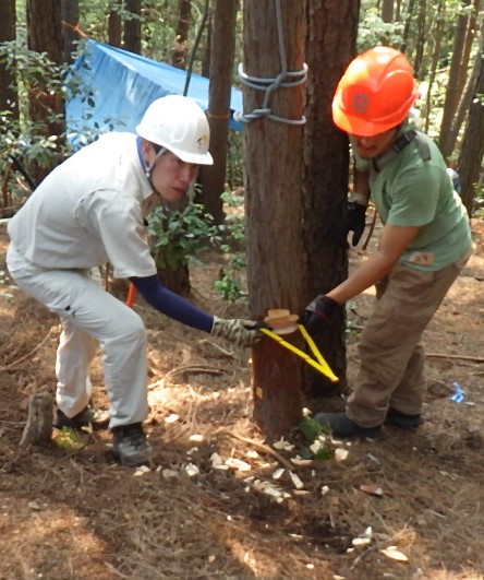 ここでは単に伐採するだけでなく、伐採木の樹高予測も実施しました。何人もの先生が、梢の位置を予測して、杭を立てました。