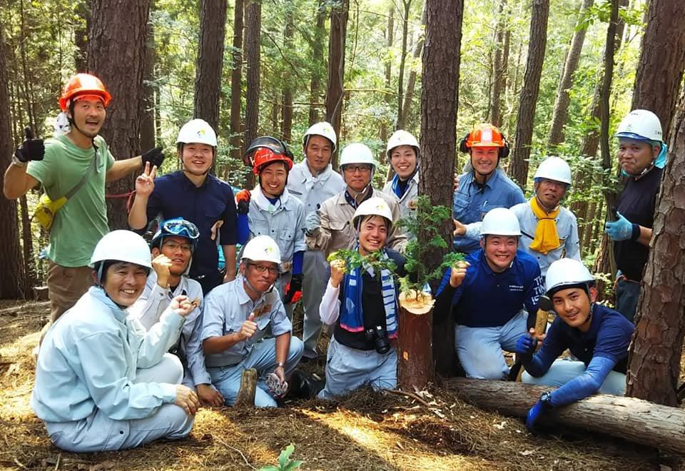 伐採したヒノキの梢は切り株に挿して、その間の丸太を頂いたことを報告し、みなで記念撮影しました。