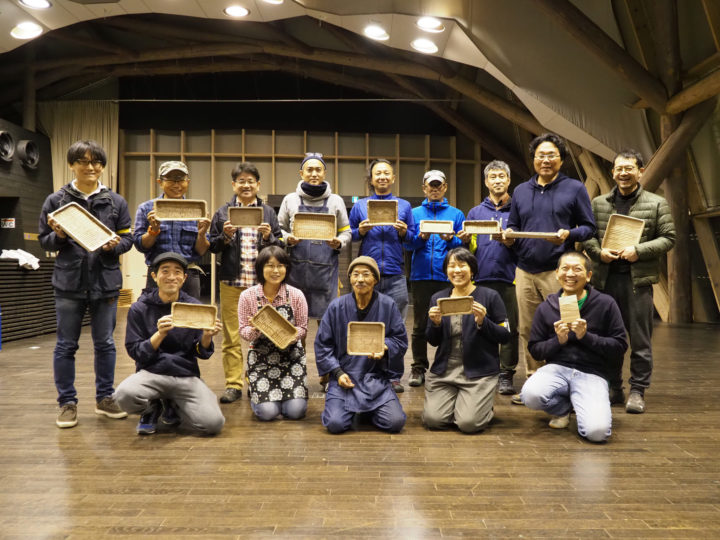 プロの木工家もいるので、ちょっとチャレンジもしてみました。ふだん森口さんが実施する講座では下の写真で手前の女性が持っているような小さいサイズの材を使うのですが、今回の講座ではかなり大きめの材も準備したのです。みなさん必死に取り組み、1時間遅れたものの全員見事完成!