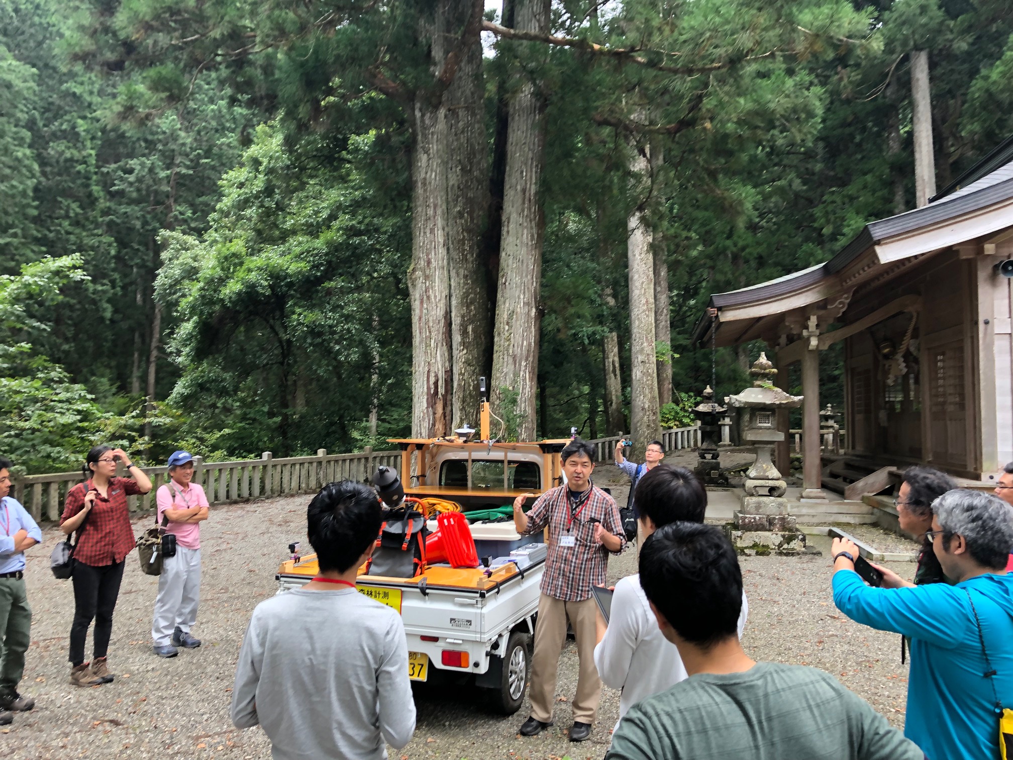 フィールドワークでは、長野県林業総合センターの戸田さんが軽トラにレーザースキャナを搭載したMMS(Mobile Mapping System)を披露してくれました。