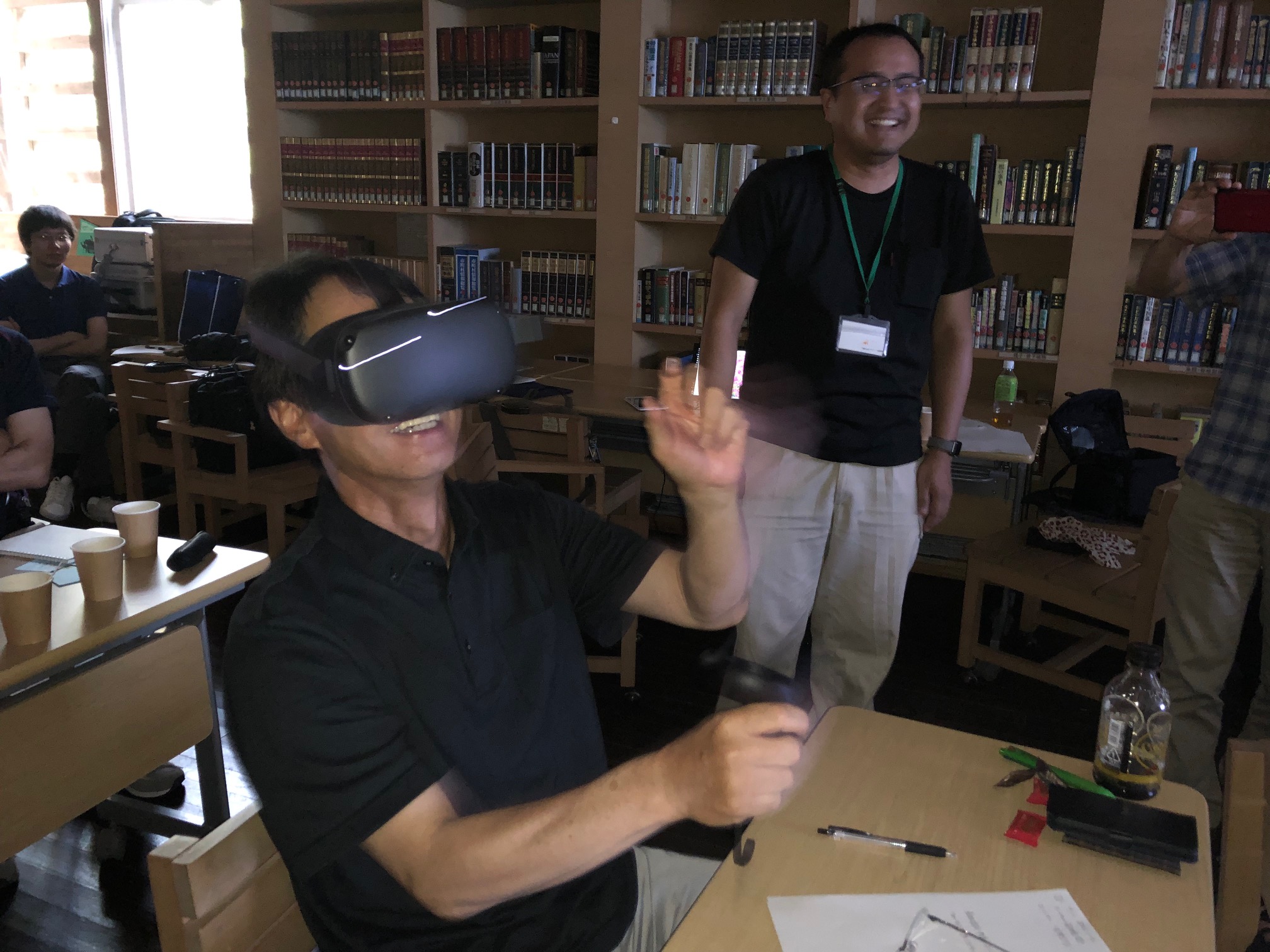 VRゴーグルを使って、安全な伐倒作業を体験することができるシステムです。アカデミー副学長の長沼さんが体験中です!