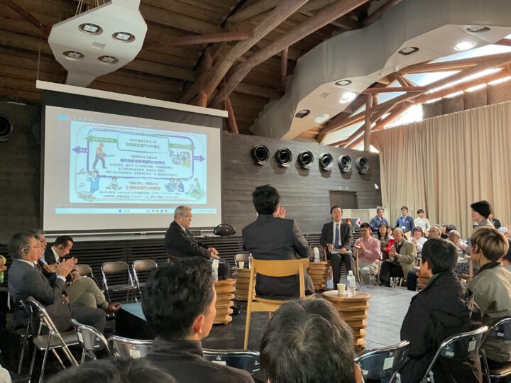 トークセッションは末松先生から日本の林業の現状と将来について、飯塚優子先生から住友林業の歴史や会社の取り組みについてお話があり、その後涌井学長の「(森林を含めた)植物は地球の生態系の母体である」というお話のあと、会場からの質問も交えながらセッションが進められました。