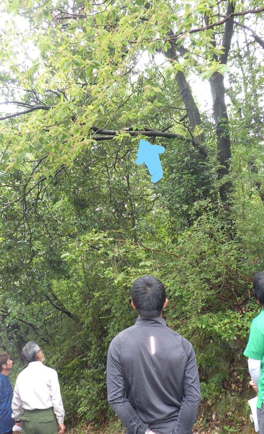 本日の課題は、目の上にある歩道に競り出たアラカシの枝2本を、バランシングでリギングしながら安全に剪定することです。