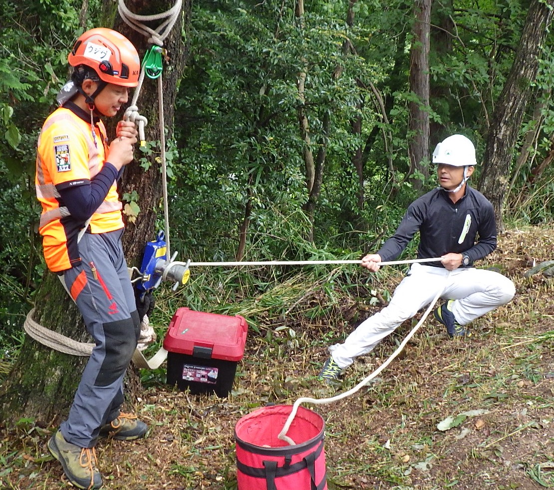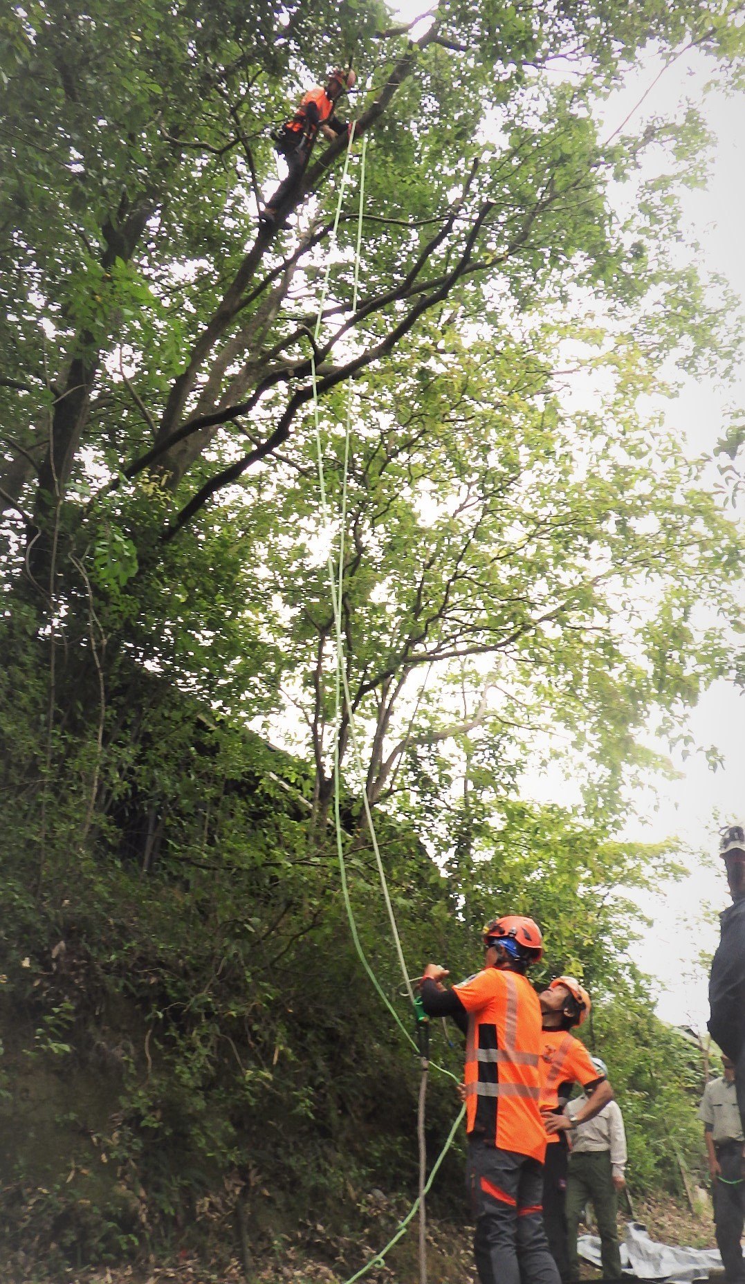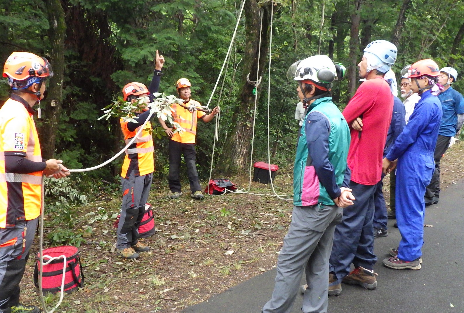 結局、宇治田さんが見本となって樹上作業を努め、受講者がリギングラインやタグラインを操作することになりました。