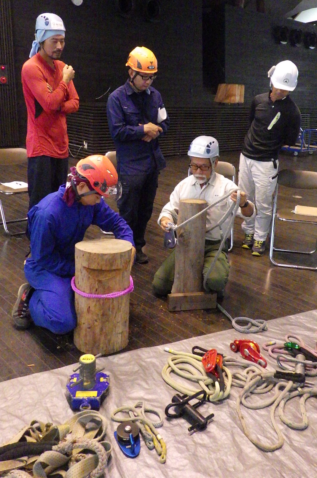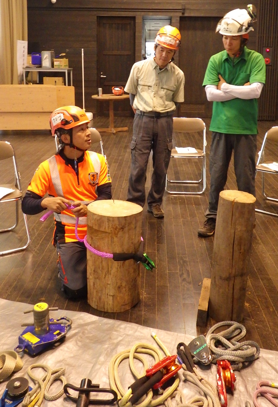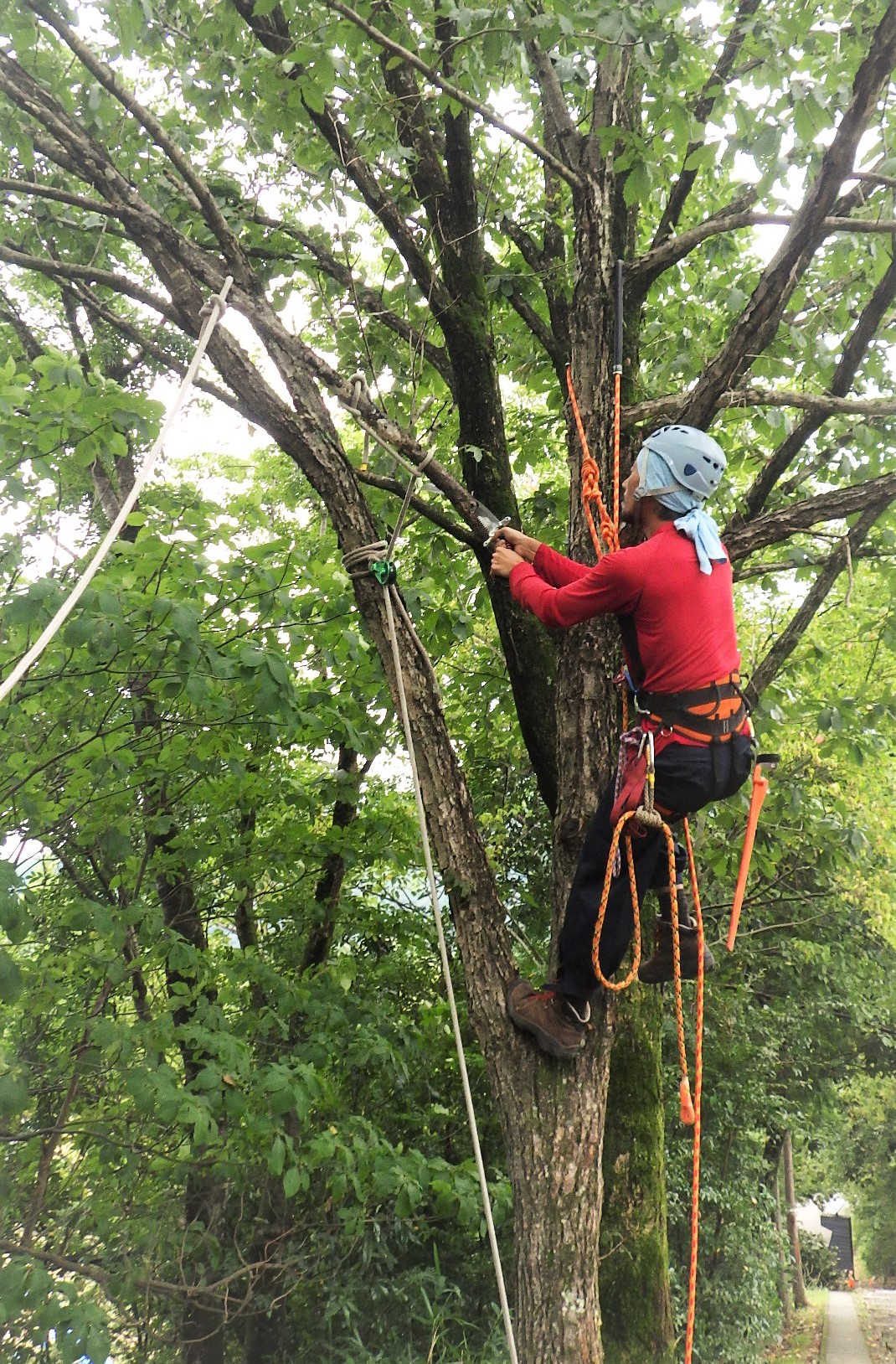 結局、宇治田さんが見本となって樹上作業を努め、受講者がリギングラインやタグラインを操作することになりました。