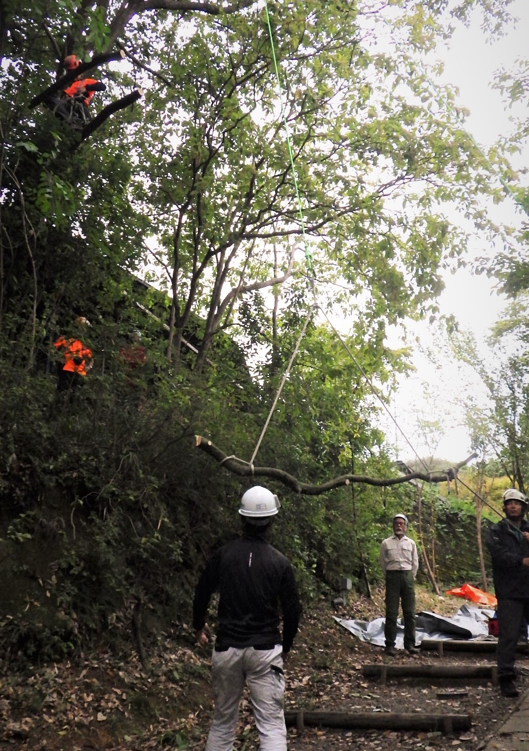 地上で操作するグラウンドワーカーがポーターラップとタグラインを操作して、安全内地に枝を下ろします。