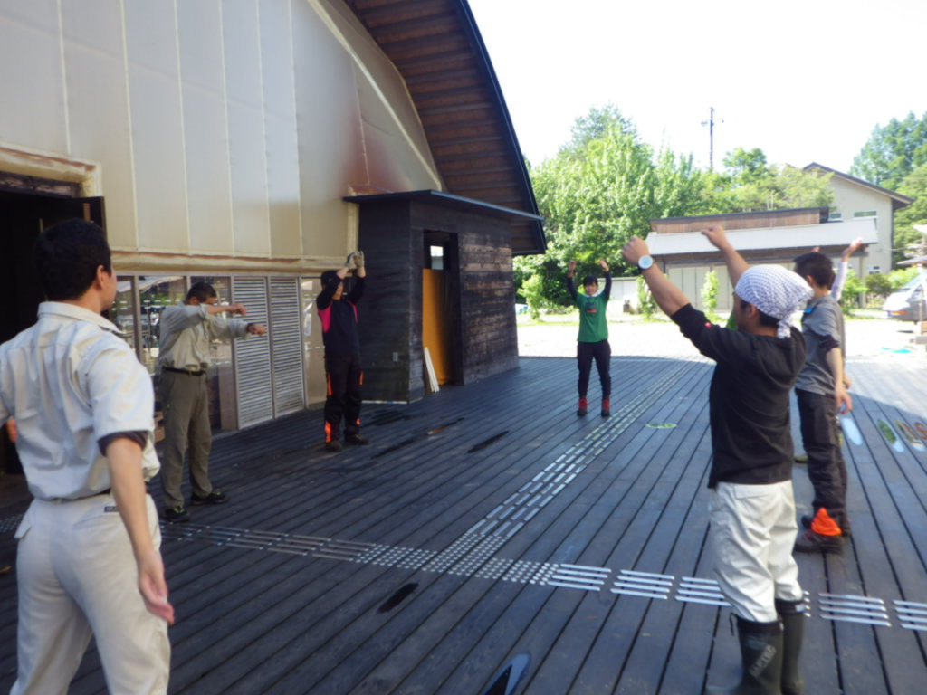 実習に際して、まずは朝の体操をして体をほぐし血行を良くします。これは振動障害予防対策の一つです。