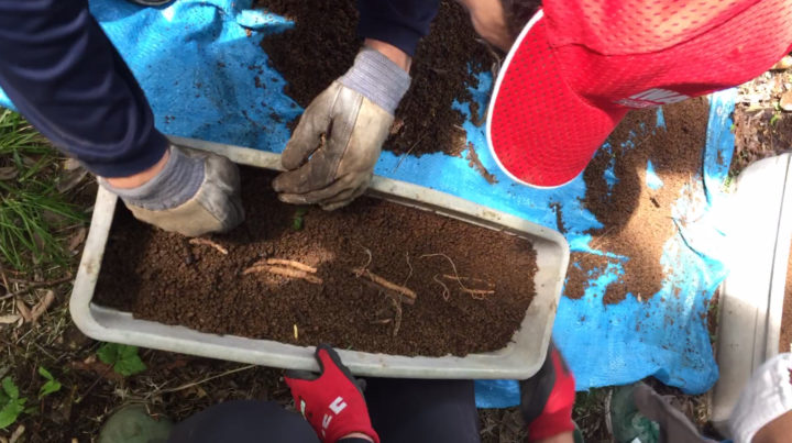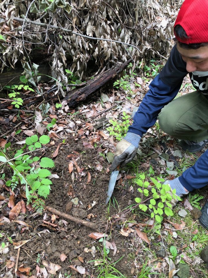 まず構内のタラノキの生え方を観察します。大きなタラノキがあれば、大抵の場合、周囲に子株が生えているのが観察されます。まずはこれが根萌芽で増えたものかを確かめます。掘ってみるとやはりつながっていることがわかりました。今回はこの根を切り取って持ち帰り種根とします。