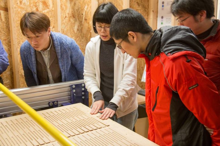 さらに、デジタルファブリケーションというと、合板やMDFをつかってものをつくるイメージが強いですが、私たちは本物の木を使います。均一素材でない無垢の木を使う場合、「どのようなことを考慮しないといけないのか」「木という素材の新しい活用の方法はないか」。そのあたりのことを学生らと一緒に考えていこう、ということで今回初めて「デジタルファブリケーションの導入」という授業を2日間かけて開催しました。