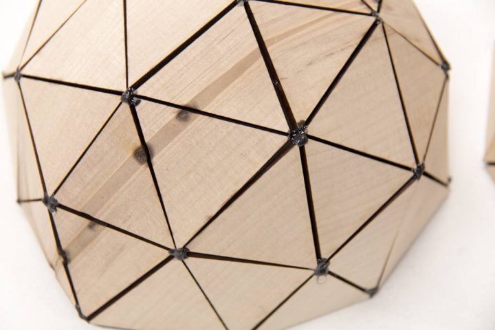 フラードーム。建築のバックグラウンドがある学生が入学時から作ってみたいといっていたフラードームがついにデジタルファブリケーションで実現しました。一枚一枚すべてサイズ形状が違うため、デジタルファブリケーションだからこそできる形状です。ホオノキの木目がつながっているところも重要なポイントです。