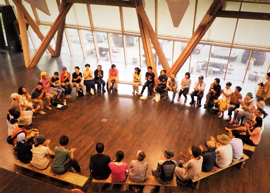 参加者同士で、「今、ここにどんな気持ちでいるのか?」、「暮らしの中で感謝していることは何か?」、「あなたは何に動かされて、このワークショップに来ているのか?」などを共有して、ギルドの仲間づくりが進行。