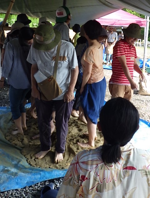 フィルさんの丁寧な解説が続く中、参加者は一所懸命に窯土をこねていました。写真で踏んでいるのは、泥と砂を15:55で混合したものです。
