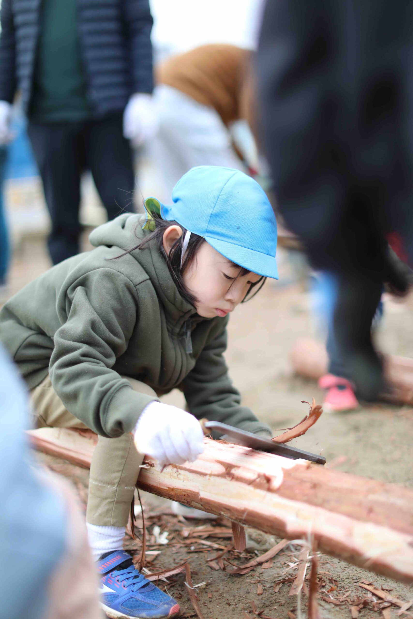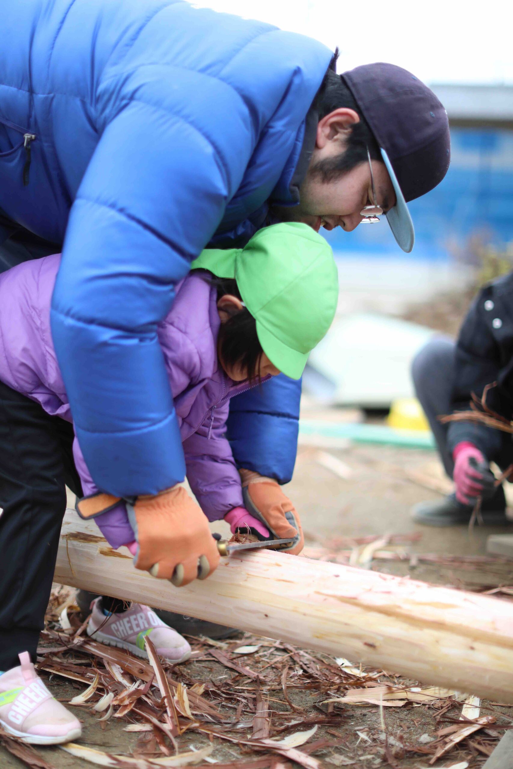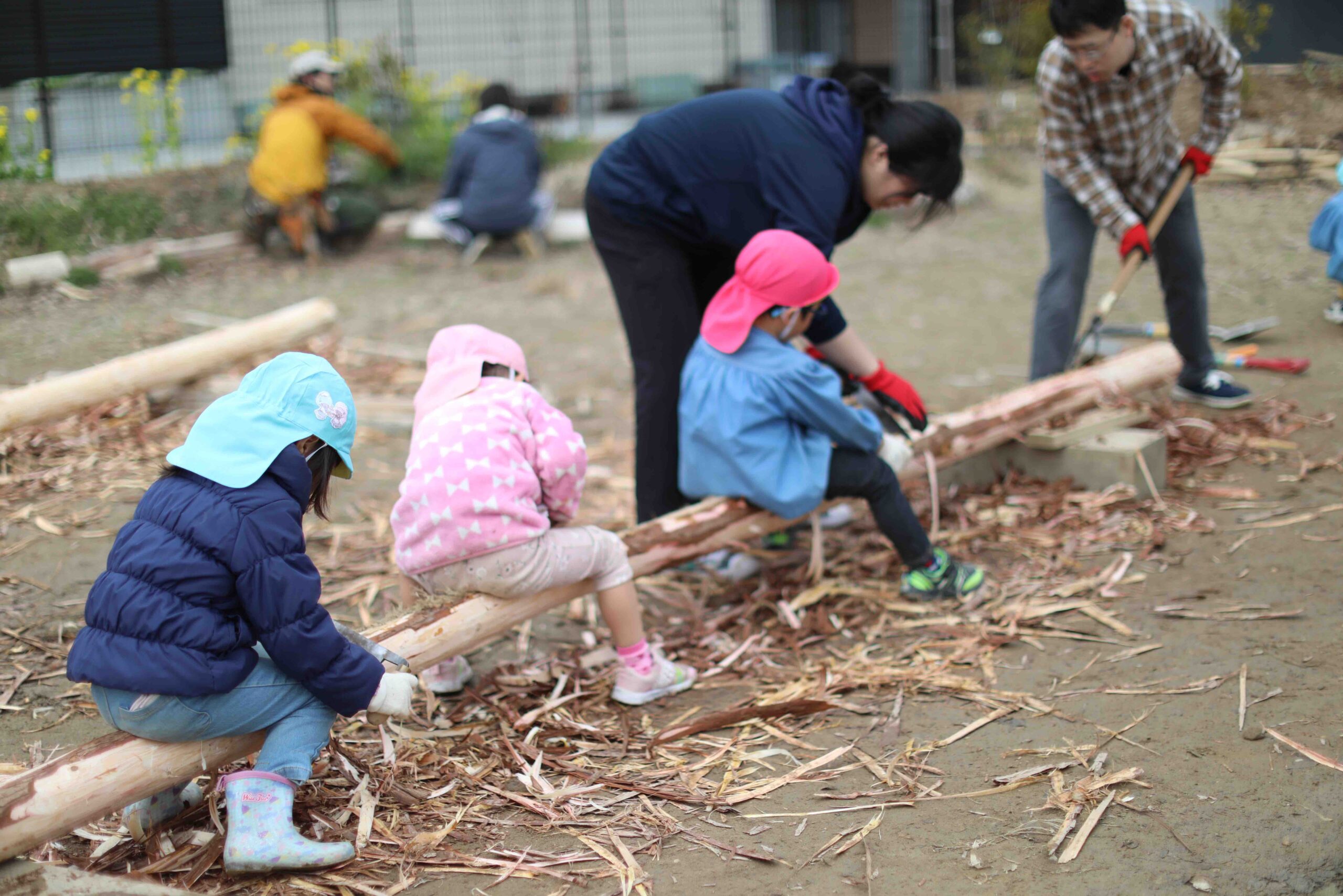 当日は、地域の人や保護者が集めてくれた資材と、馬搬(馬で森から木を出す伝統技術)で森から運び出した丸太を使っての作業でした。大きな丸太を運ぶ作業や、遊具をつくるための檜の皮剥き作業で、子どもたちが群れをつくり、夢中になって関わる姿が印象に残っています。