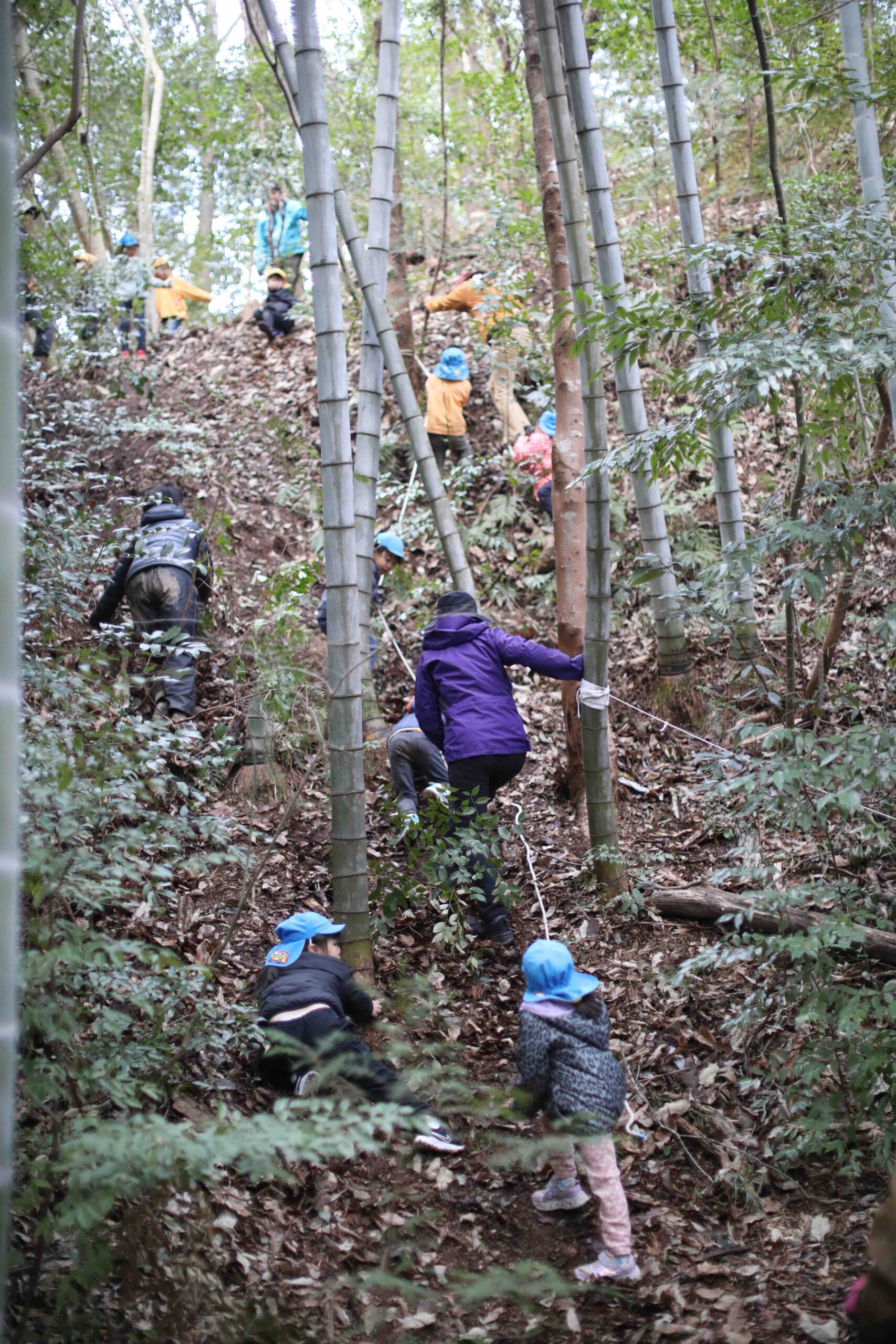 園児も元気よくやってきて、一緒に遊びました。急斜面にロープをかけて登ったり、森を探検してタヌキのため糞や木の実を見つけたり、つるでターザンごっこをしたり、焚火をしたり。