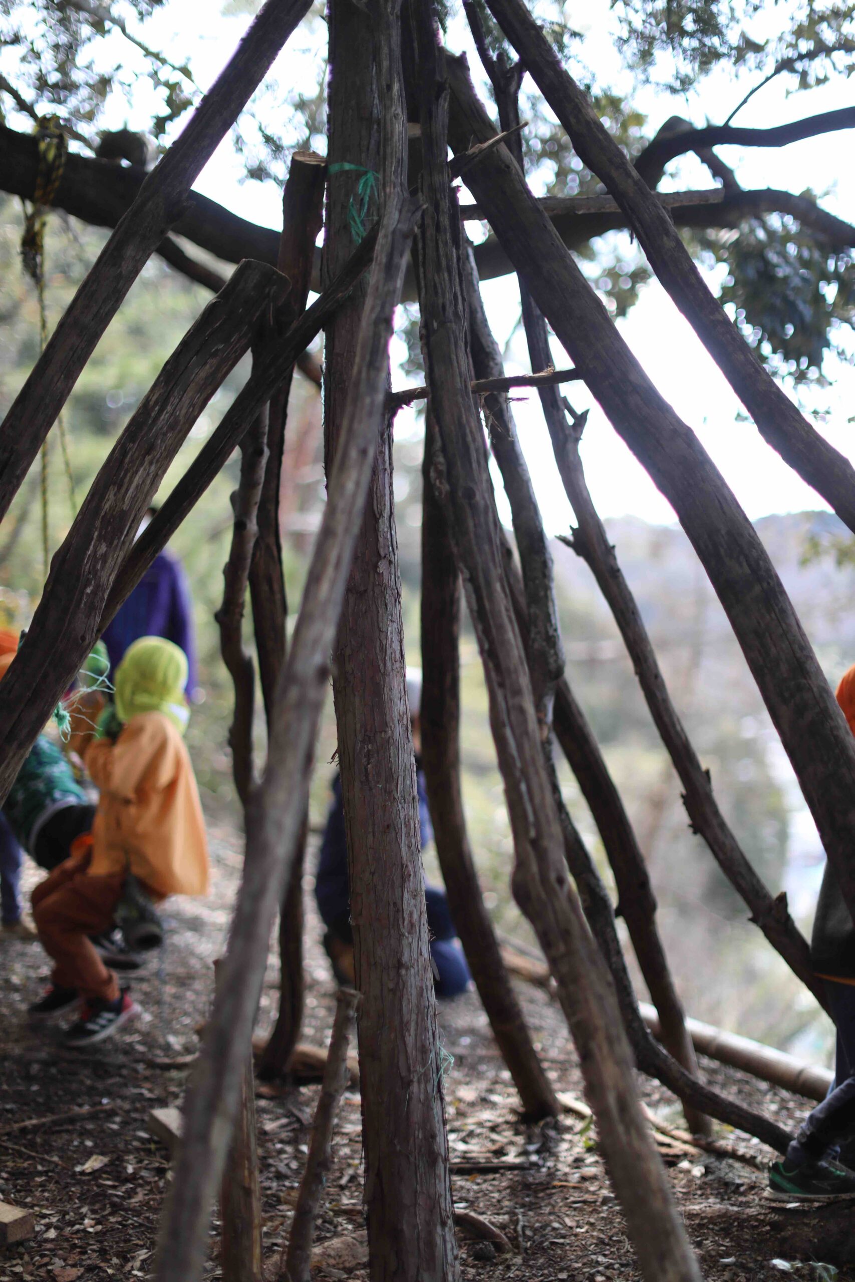 保育士さんたちも、竹にロープや蔓をかけたジャングルジムづくりに挑戦したり、森から焚火の薪を集めてきてノコギリで切ったり、フィールドの安全性を観察したり、人によっては普段はあまりやったことのない実践の中でスキルを磨きながら、子どもたちがどのように自然の中で遊びを発見していくかを観察しました。