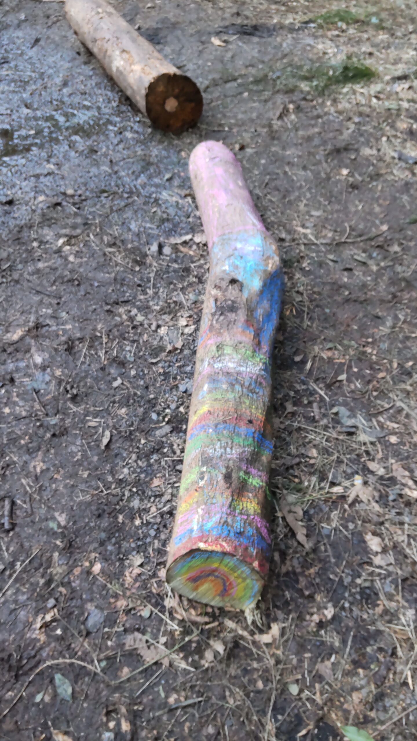 子どもには、「遊び」「仕事」「学び」の境目はありません。焚火のまわりに座る場所を作るために、子どもたちが協力してロープで丸太を運ぶなど、遊びながら、学びながら、子どもたちも森の整備に参加しました。運んだ丸太にクレヨンで絵を描いて、素敵なベンチができあがりました。