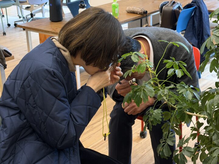まずは室内で、オフィスにある観葉植物を使い、観察の練習からスタートします。