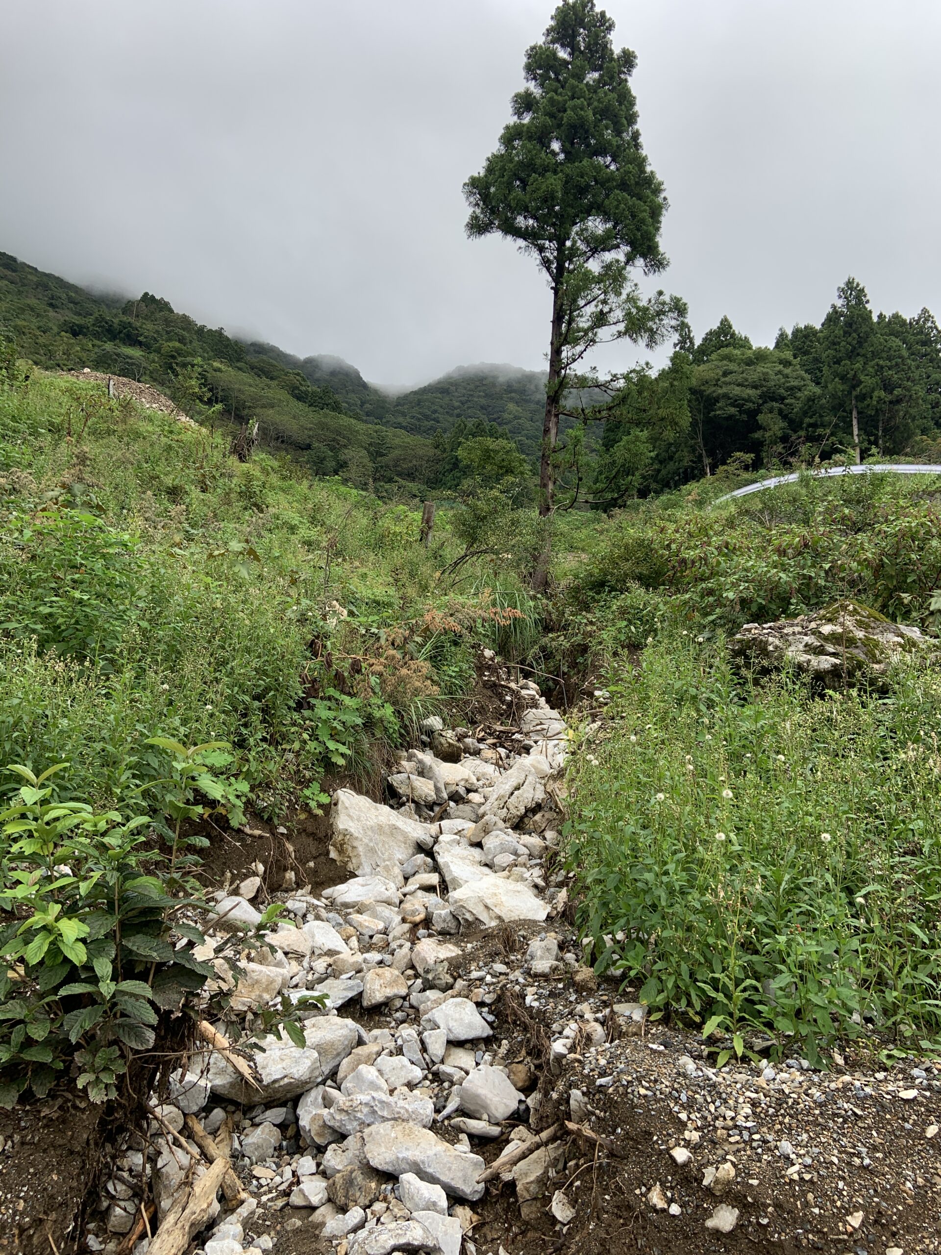 また、所々で山の崩落もみられます。伊吹山とその麓の春日地区は、石灰岩の地質で大きな木が育ちにくく、その地質ゆえに希少な植生が育ってきたそうです。しかし石灰岩質は崩れやすく、近年土砂崩れなども多くなってきたそうです。