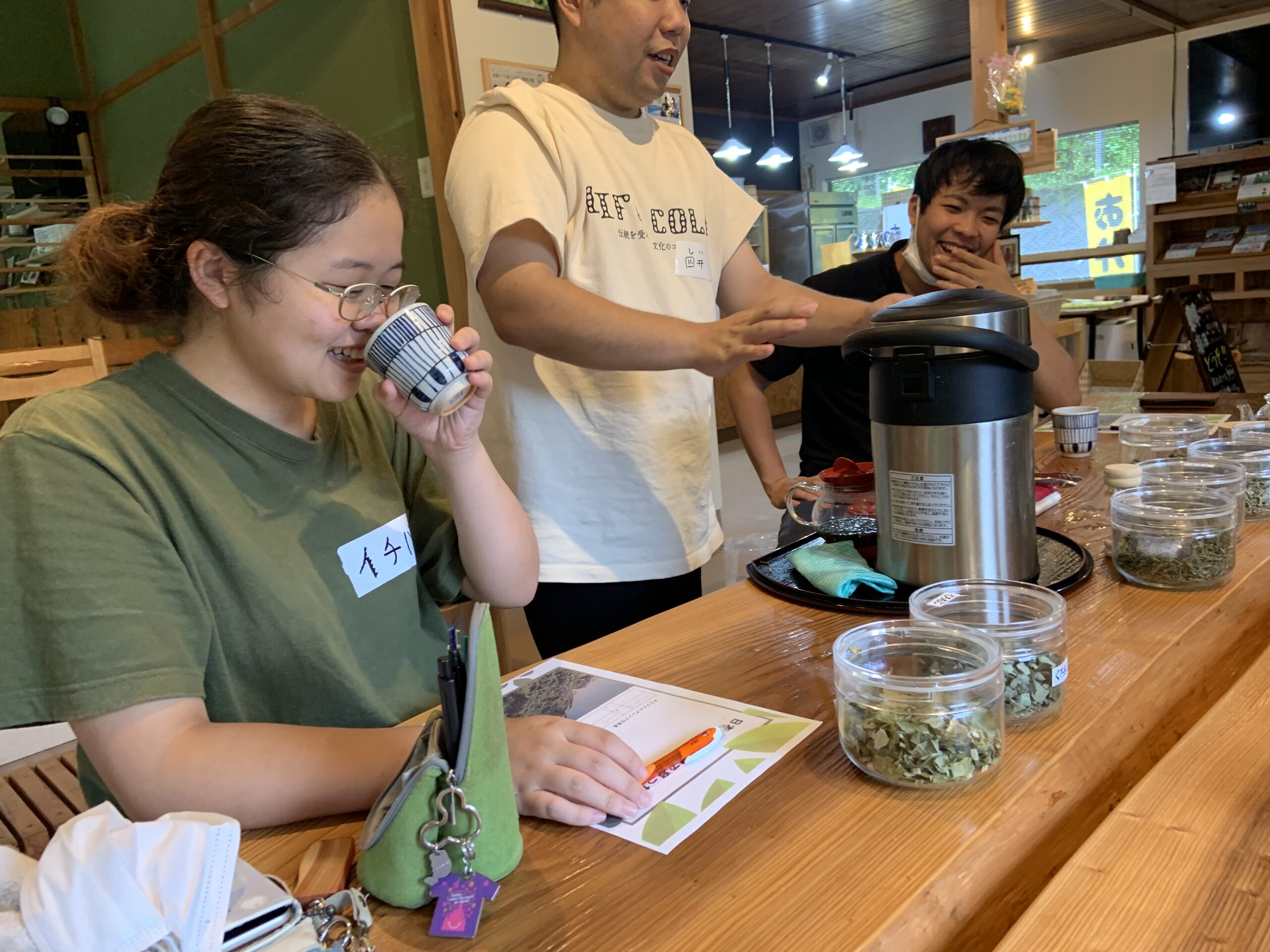 ドクダミ、カキドオシ、ヨモギ、スギナ、クロモジなど、約10種類の薬草をお茶にしてテイスティング。色や味、そして香りを感じながら、それぞれの薬草の個性を見極めていきます。