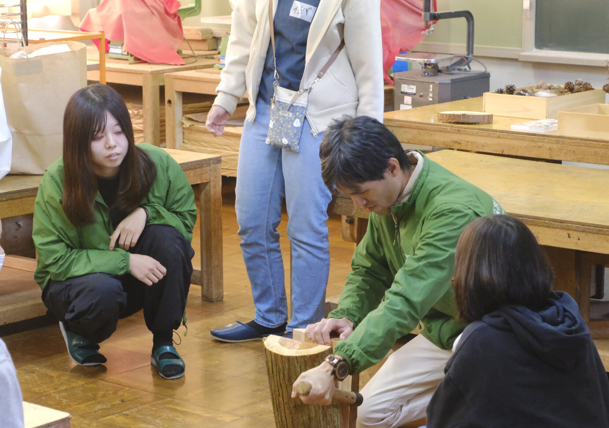 私には木のいろいろな使い方を知ってほしいという想いもあり、丸太を割る体験や曲げ木の要素を入れた「飾り台を製作する」内容として構成しました。プログラムの流れや内容が、授業のねらいに沿っているかどうか何度も打ち合わせを行い、内容を検討しました。