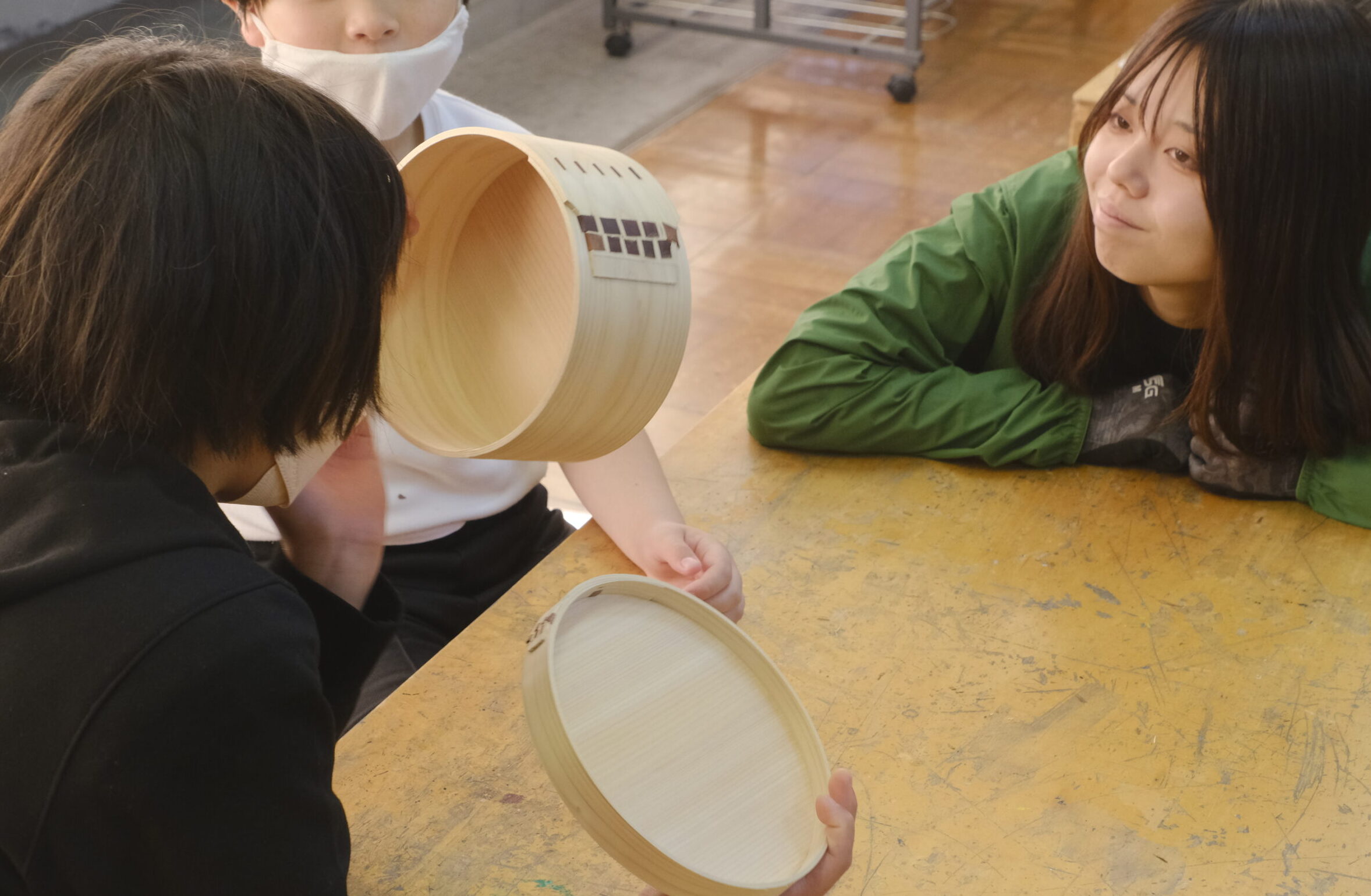 木を板の状態に加工できたところで、古くから生活道具としても親しまれている、曲げ木を利用した「せいろ」や「おひつ」、そしてこの後に製作する飾り台のヒントになった「曲げわっぱの弁当箱」を紹介しました。