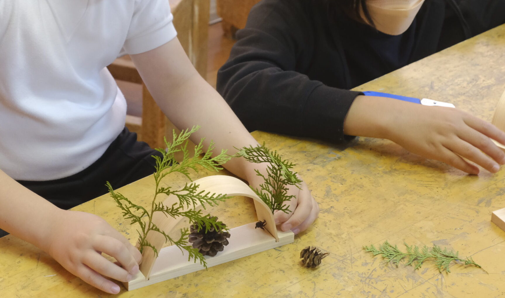 木を固定して、じわじわと曲げていく作業は難しいです。しかし子ども達は、時には失敗もしながら、時間をかけて「木のものづくり」を楽しんでいました。