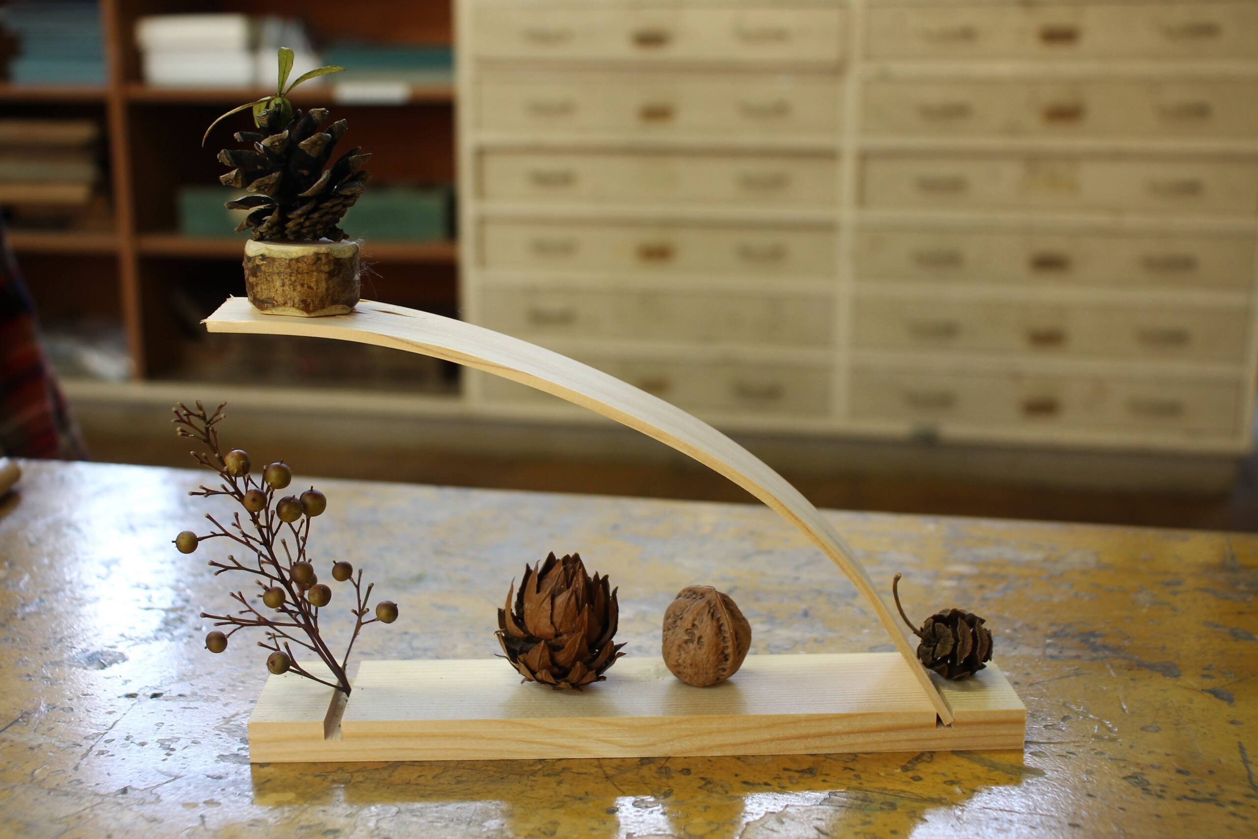 これらに使われる曲げ木について、どのようにして木が曲がっているのか、今回制作した「飾り台」を見せながら。図などを交えて説明しました。難しい言葉を使わないように意識し、