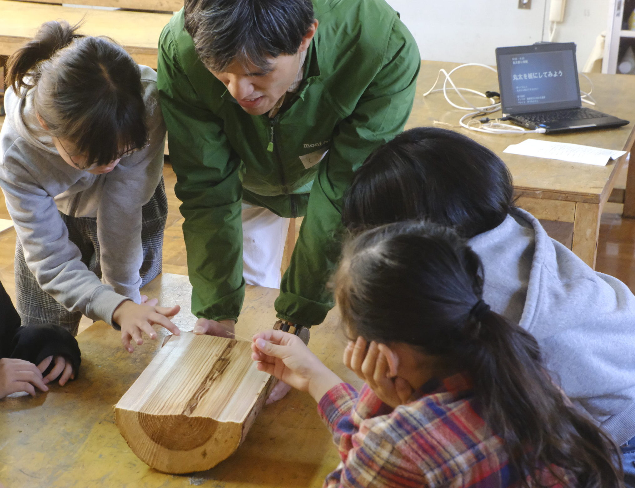 まずは丸太を割る体験を行いました。丸太が板になる過程を体験してもらい、丸太の状態では見えなかった木の姿や、木目などの表面の様子や触った感触などを確かめるように注意深く観察しているこどもたちの様子が見れました。