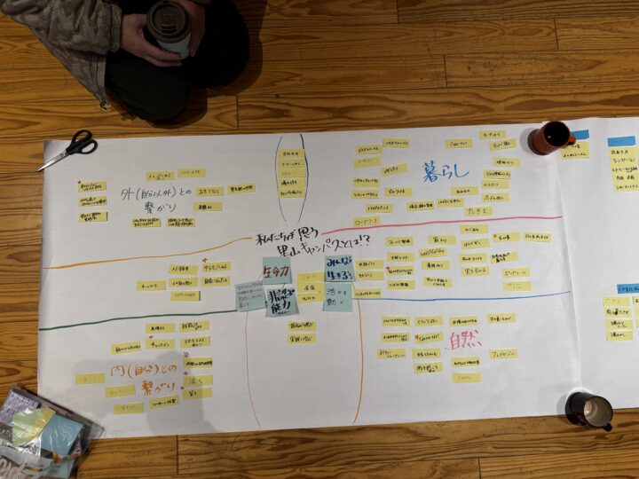 1年生、2年生、そして科目履修生の2名が混ざり、2班に分かれてふりかえりました。最後に、それぞれまとめたものを見ながら「どんな学びがあっったのか」「自分にとって、里山キャンパスはどんな場だったのか」をシェアしていきます。
