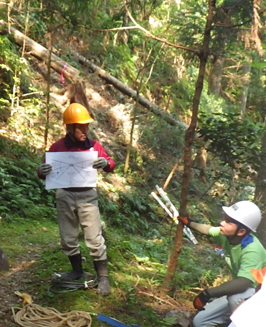 現場でどのように伐採するのか、山の神に対する儀礼はどうするのか、安全のために何をすべきかなど、実践に向けて様々な項目を無量小路さんから教えて頂きました。この三ツ紐伐りは伊勢神宮のご遷宮に合わせて、木曽と裏木曽でヒノキを伐採する時に用いる手法です。