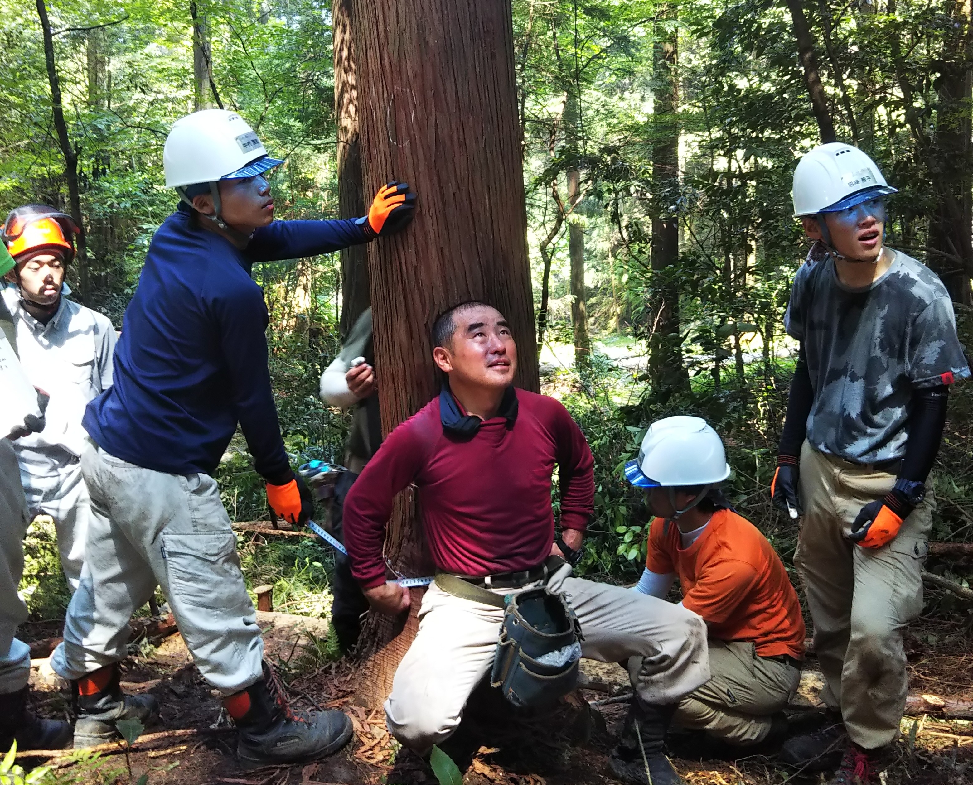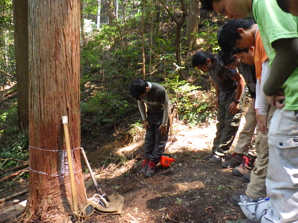 与岐を入れる受け口側で、幹を背にして両手で幹を押さえて、伐倒方向確認をします。無量小路さんに続いて、学生も方向確認を繰り返し、受け口の大きさと横ヅルの位置を決定しました。