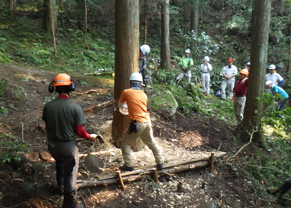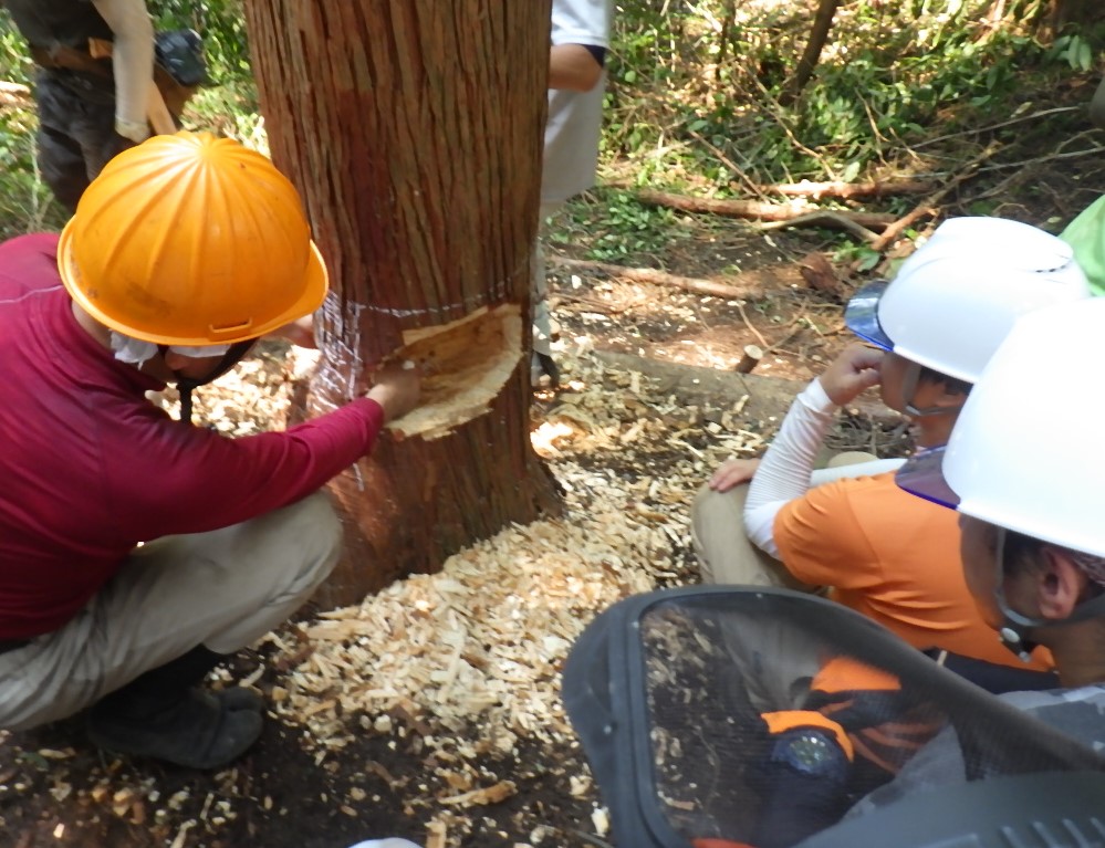 この古式伐採手法実施にあたり、連携協定先の中津川市の協力もあり、中津川市の「三ツ伐り保存会(みつぎりほぞんかい)」の無量小路 清さんの指導を受けて実施したものです。