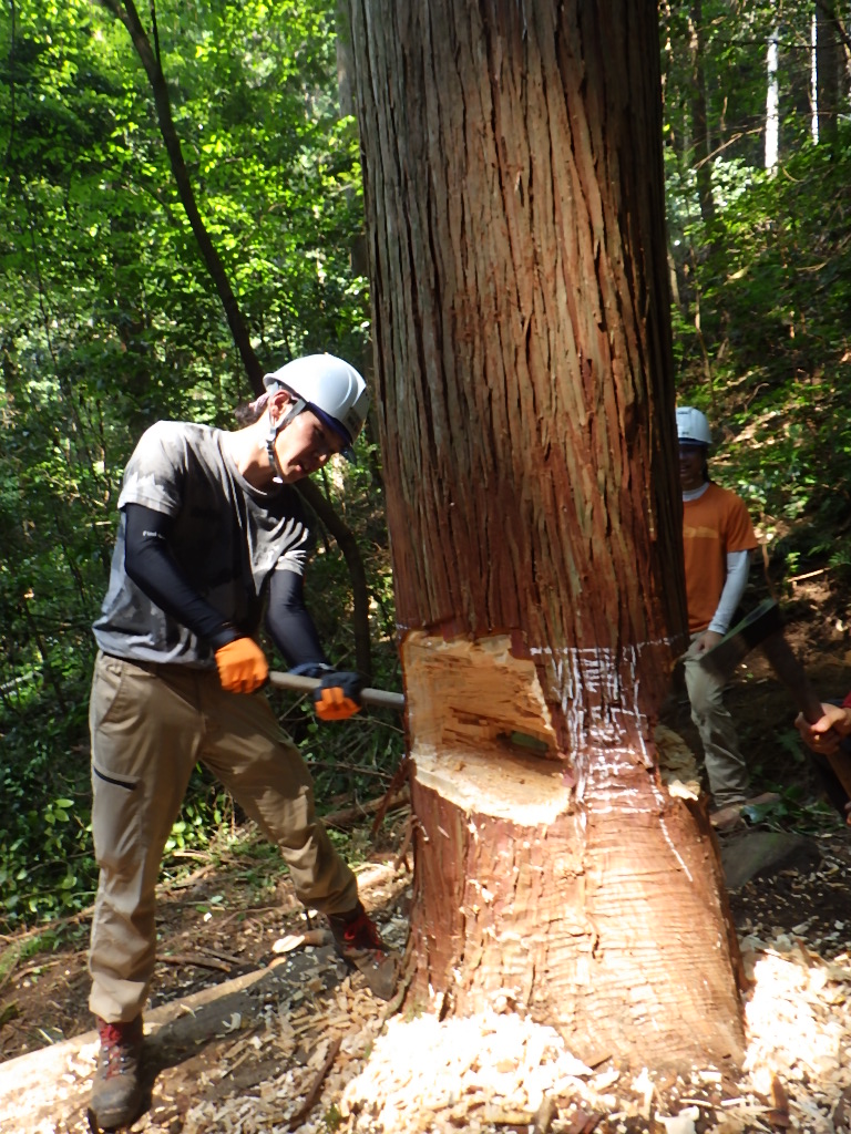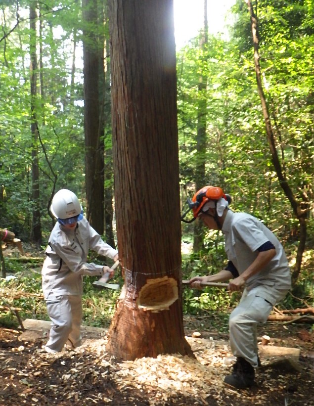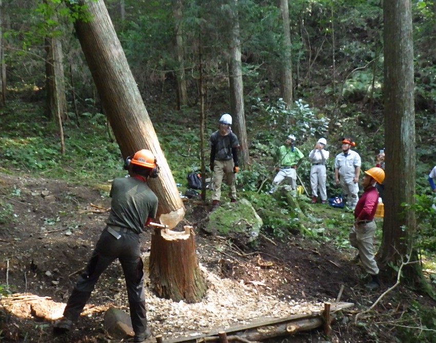 今回伐採に協力して下さった中津川市役所、中津川市の三ツ伐り保存会のみなさま、直接指導して下さった無量小路 清さん、学生と伴に下準備して下さった杉本先生、新津先生、玉木先生、辻先生、松井先生、伊佐治先生、多くの学生さんたちに感謝致します。