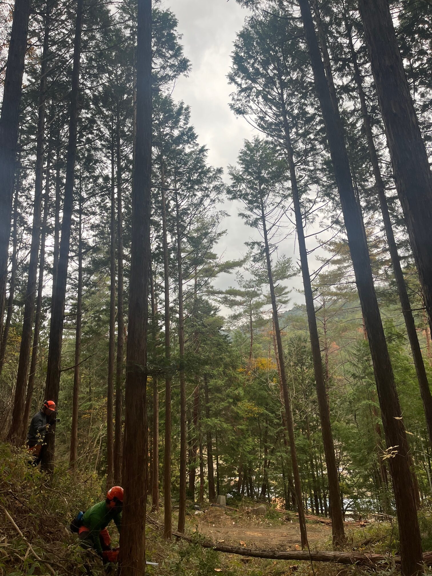 この現場では、すぐ下に林道があるため斜面下方に伐採です。今回伐採した林分は、天然生のヒノキ林分で100年以上の林齢でした。