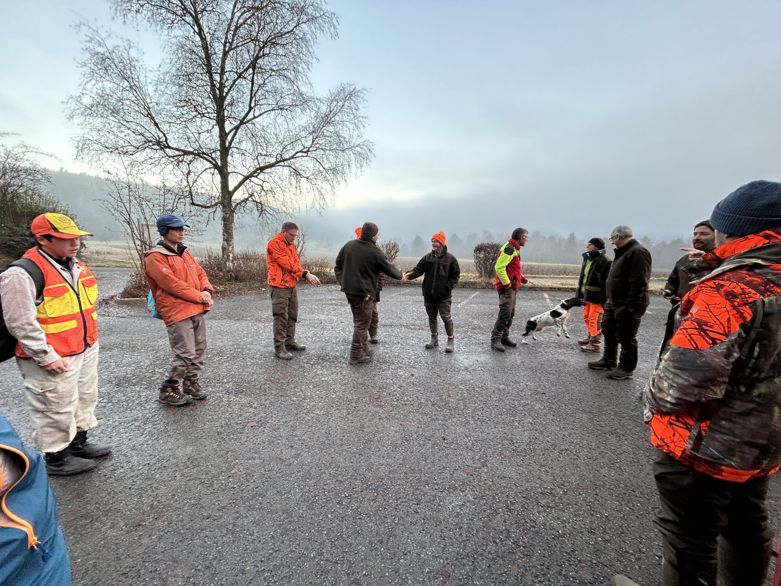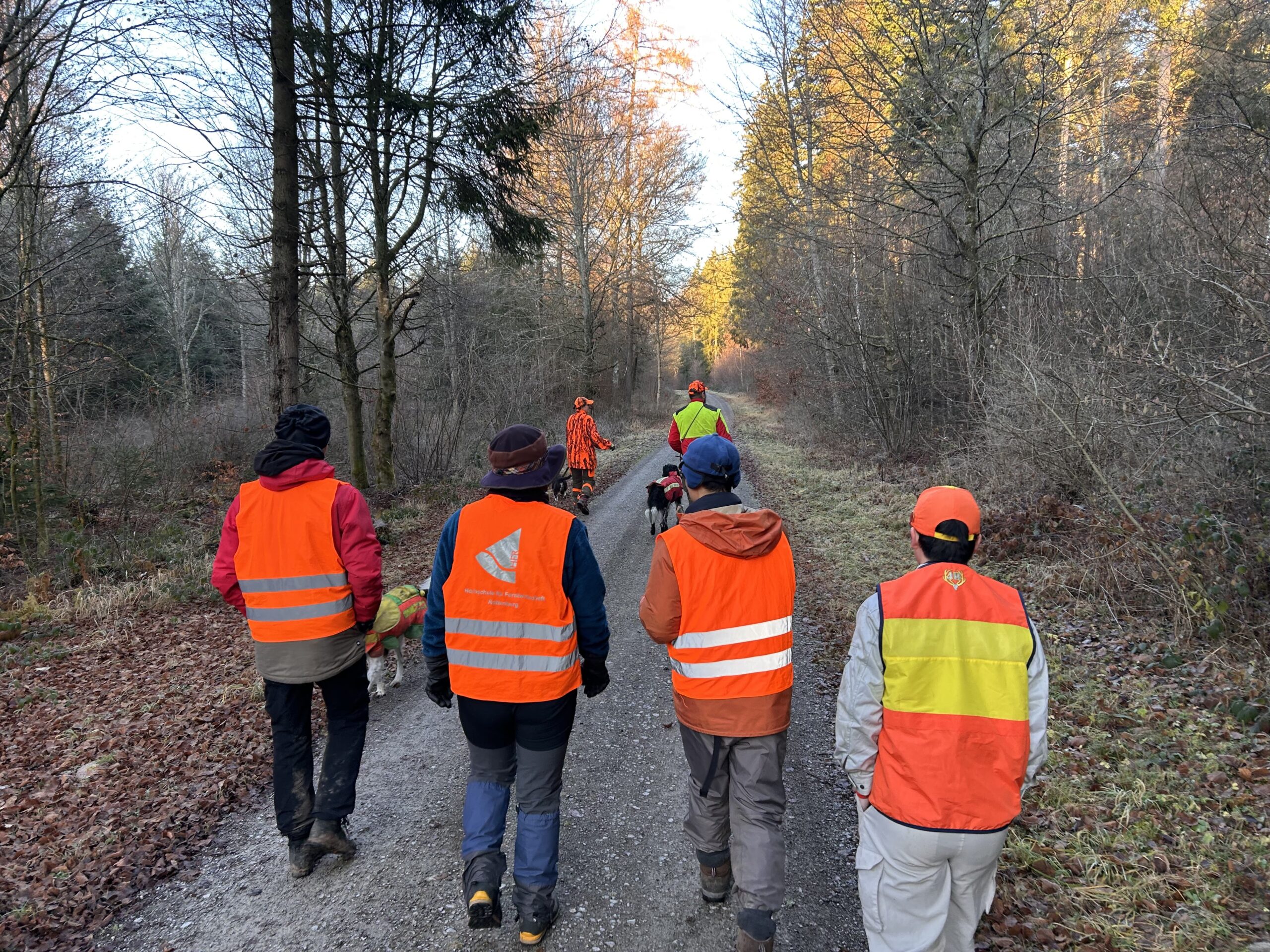 今回の巻狩りは、この区域を担当する森林官に声をかけられて集まった地元の猟師の方々によるもので、昨日参加したロッテンブルク林業大学主催の巻狩りと比べると、20人(フォレスター&猟師14名+我々)ほどの小規模なものでした。※昨日の巻狩りは合計150人程