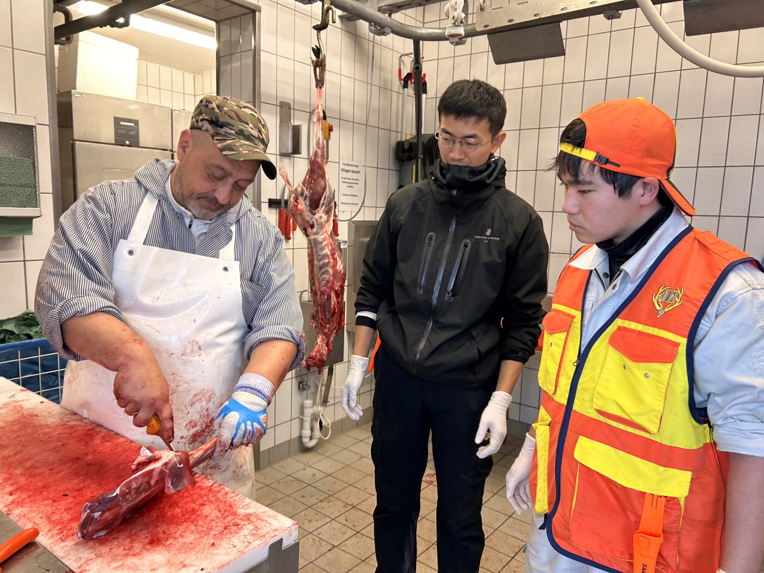 午後には、ロッテンブルク林業大学で、前日の巻狩りで捕獲されたノロシカの解体処理を見学しました。指導してくださったのは、チュービンゲンで食肉加工の職業訓練学校の先生をされているブッチャーのヨッヘンさんです。