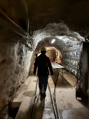 この山には22の坑道があり、総距離はおよそ100km、深さは約800mにもなるそうです。鉛や亜鉛が採掘され、現在も活字やバッテリー、レントゲンなどに利用されています。ツアーの中で、坑道を掘り進める際に使われる掘削機の実演があったのですが、想像以上に音が大きく驚きました。林業でもチェーンソーなどかなり大きな音の出る機械が使われますが、坑道が閉鎖的な空間だったこともあってかそれ以上だったように感じました。