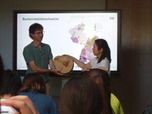 午後はフライブルク州の林業試験場であるFVAを訪問し、研究員の方々にお話を聞きました。試験場では380人の方が働いており、日々新しい技術の導入に向けて研究されているそうです。この日は、4人の研究員の方々がそれぞれの専門にしておられる分野について講義をしてくださいました。近年の大きな課題である地球環境問題に対処するため、菌類、野生動物管理、木材のCTスキャン技術などさまざまな角度から気候変動に適した森林、林業の在り方を考察していました。