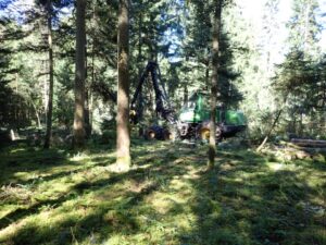 午前中は素材生産の現場を見学しました。施業地の選木はすべてフォレスターに任されていて、木の質、樹種の多様性、階層の多様性などを総合的に判断して将来木を選定しているそうです。現場にはフォレスターが選定した、マーキングされた将来木があちこちにありました。