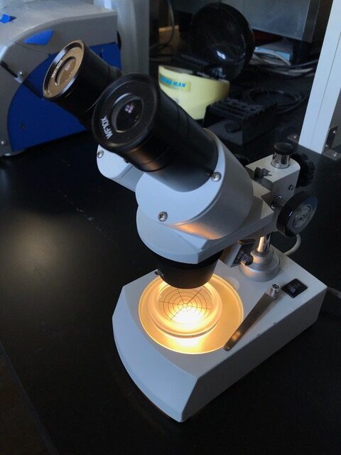 ただし線虫は小さいので肉眼では数えられません。このように実体顕微鏡のステージにのせて数えます。