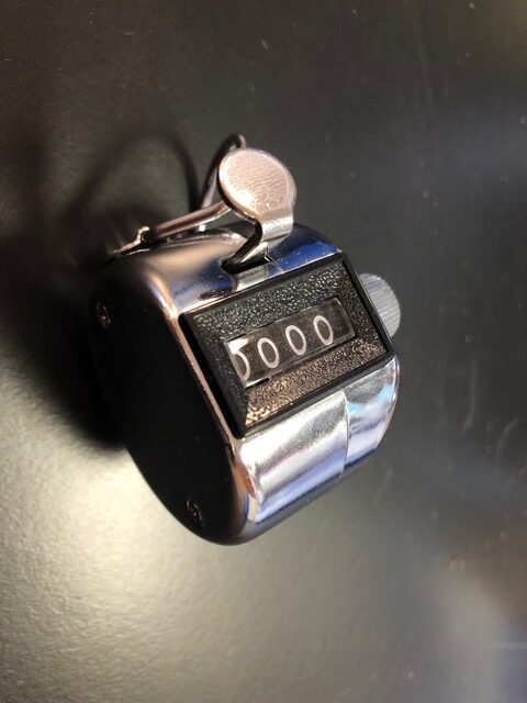 顕微鏡を覗きながら数え上げるには数取器(カウンター)を使います。日本野鳥の会の人や交通量調査の人が使っているやつですね。