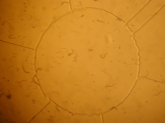 1枚目写真の右のお皿を使って実際に顕微鏡で覗くとこんな感じです。ちょっとブレていますが、真ん中の丸と周辺の区画がわかります。うねうねとしている大小さまざまなものが全て線虫で、親が産んだ卵(楕円形の点)も見えています。これを数えていくわけですが、これだと真ん中の一区画に100頭以上。全てを数えたとしたら何千頭〜何万頭にもなるでしょう。流石にこれは数えられません。このような場合は早々に見切りをつけて希釈します。